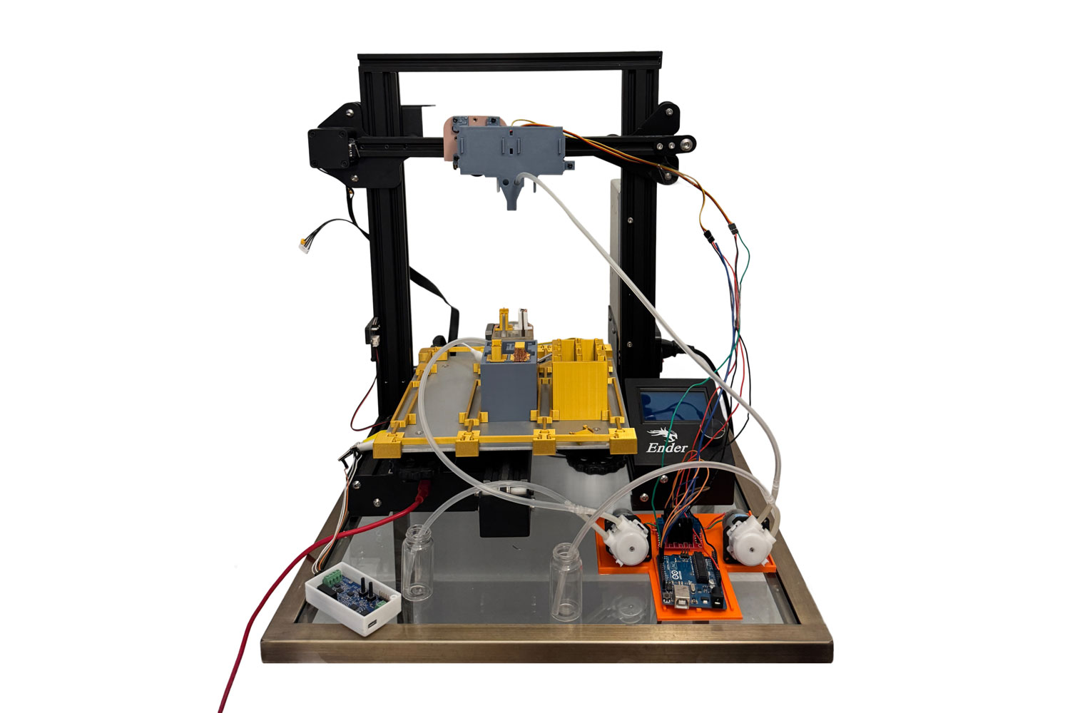 The rest of the system the students designed was built from off-the-shelf parts; Kalashnikov estimates its total cost at under $500. The system repurposes a consumer 3-D-printer gantry, adds aquarium-grade pumps for liquid handling, a dual-servo gripper for electrode transfer, and a handful of 3-D-printed brackets and baths.